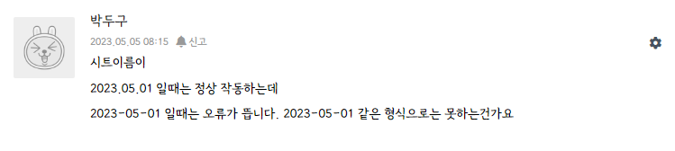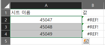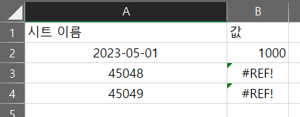 아, 저희 눈에는 시트 이름이 2023-05-01 로 보이지만, 실제 셀 값은 45047이라는 값이어서 제대로 읽지 못하는 것이었습니다.