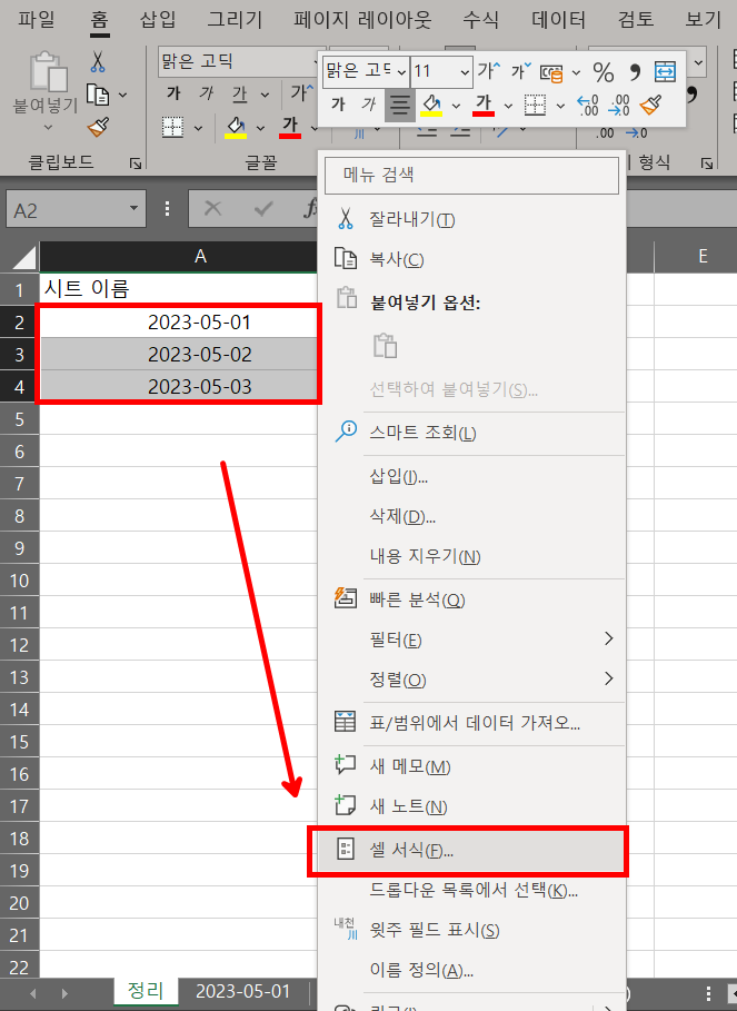1. 시트 이름이 들어간 셀을 선택해주고 -> 우클릭 -> 셀 서식을 눌러줍니다.