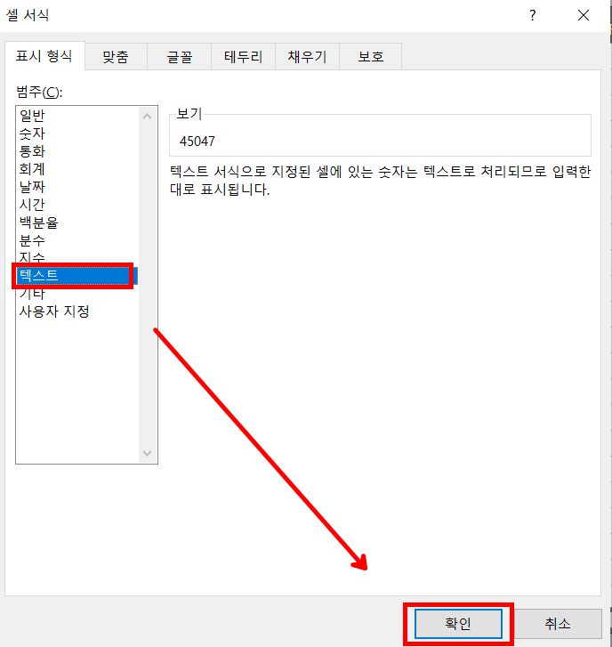 2. 범주를 텍스트로 선택해주시고 확인을 눌러주세요.