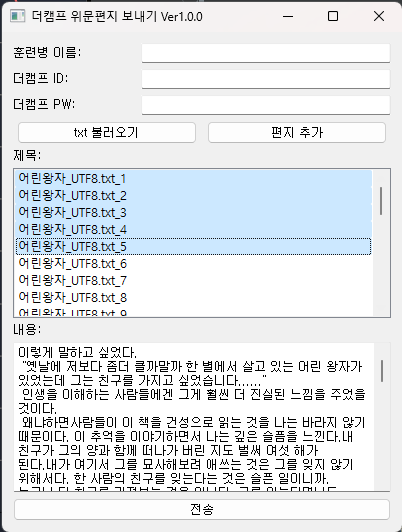 - txt 파일을 불러오면 전체 글을 위문편지 최대 글자 수인 1500자로 나눠주는 기능입니다.