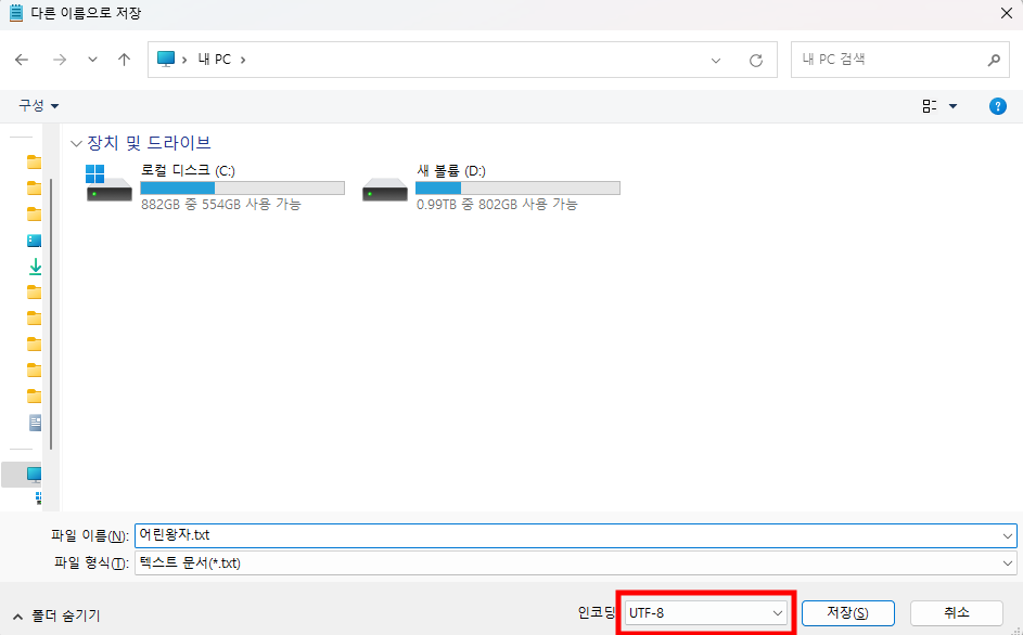 - txt 파일 > 다른 이름으로 저장 > 인코딩 UTF-8 선택 > 저장 해줍시다.