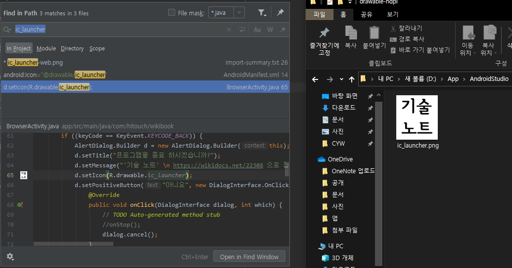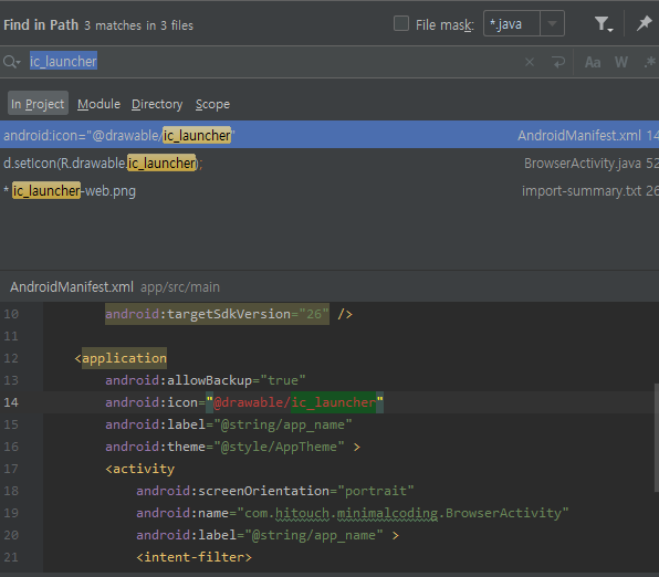 문제되는 ic_launcher가 파일명인것을 확인