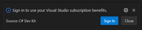 Visual Studio 구독을 인증하라는 메시지가 뜬다.