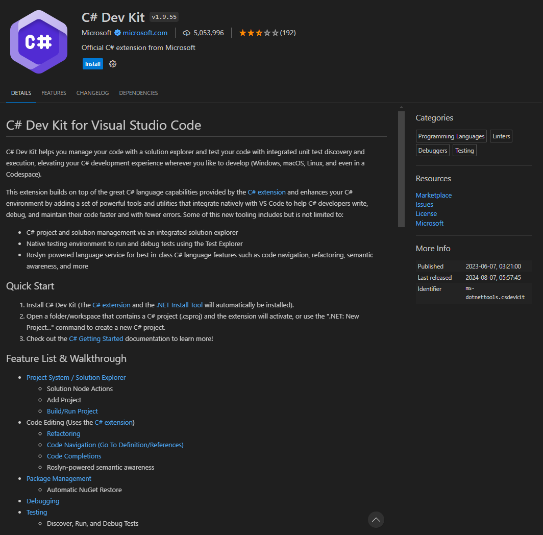 1. Install C# Dev Kit (The C# extension and the .NET Install Tool will automatically be installed).