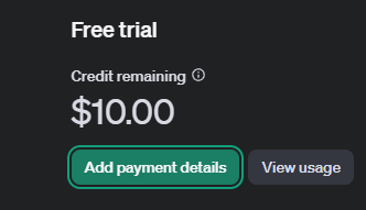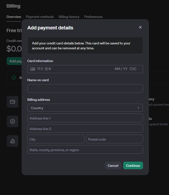 Billing 페이지에서 결제 방법 추가(Add Payment details) 버튼을 클릭합니다.