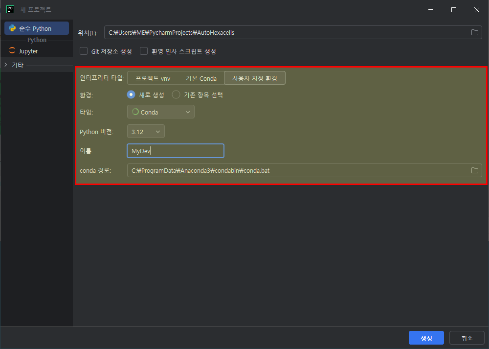 pycharm 에서 콘다 지정(초기 1회는 새로 생성)
