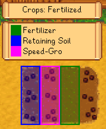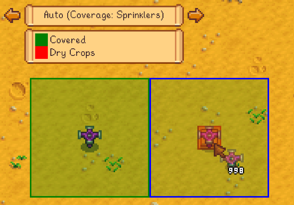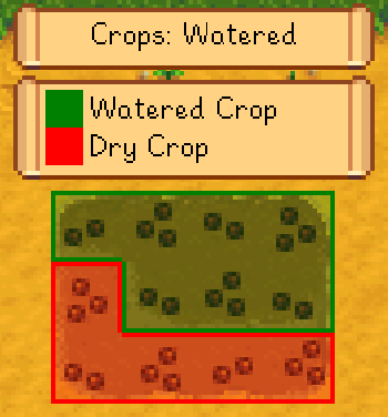 논 작물이 자동 급수 및 보너스 성장을 할 수 있을 만큼 물에 가까운 타일이 무엇인지 보여줍니다.