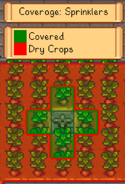 오버레이를 표시하려면 F2를 누른 다음 [왼쪽 CTRL]과 [오른쪽 CTRL]을 눌러 데이터 레이어 간에 순환합니다(버튼 구성 가능). 커버리지 레이어(예: 허수아비 또는 스프링클러)의 경우 커서로 하나를 가리키면 해당 범위 주변에 파란색 테두리가 표시되고 해당 테두리가 없는 커버리지 주변에 녹색 테두리가 표시됩니다.