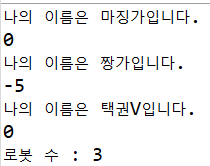 | static 변수 | 변수 앞에 static을 붙여서 사용한다. 객체를 생성하지 고도 사용할 수 있음. 생성된 객체들의 경우 공통된 저장공간 가지고 사용할 수 있다. 여러 객체들을 생성했을 때 static변수는 그 객체들이 공유하여 사용하게 된다. 한 객체에서 이 변수을 바꾸면 다른 객체도 바뀐 값들이 적용된다. 사용방법 : 클래스명.변수 |