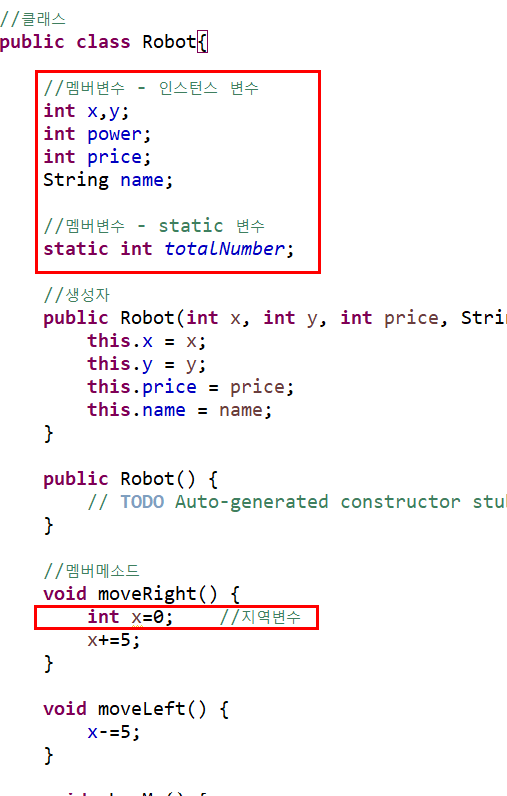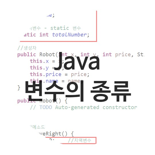 | 지역 변수 | 메소드, 생성자 안에서 사용되는 변수이며, 그 안에서만 사용가능함. 메소드 실행이 끝나면 값이 자동으로 사라져서 사용할 수 없게 된다. |