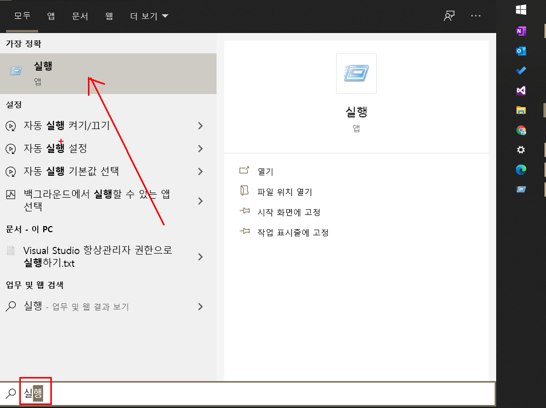- 윈도우키 누르고 '실행' 검색