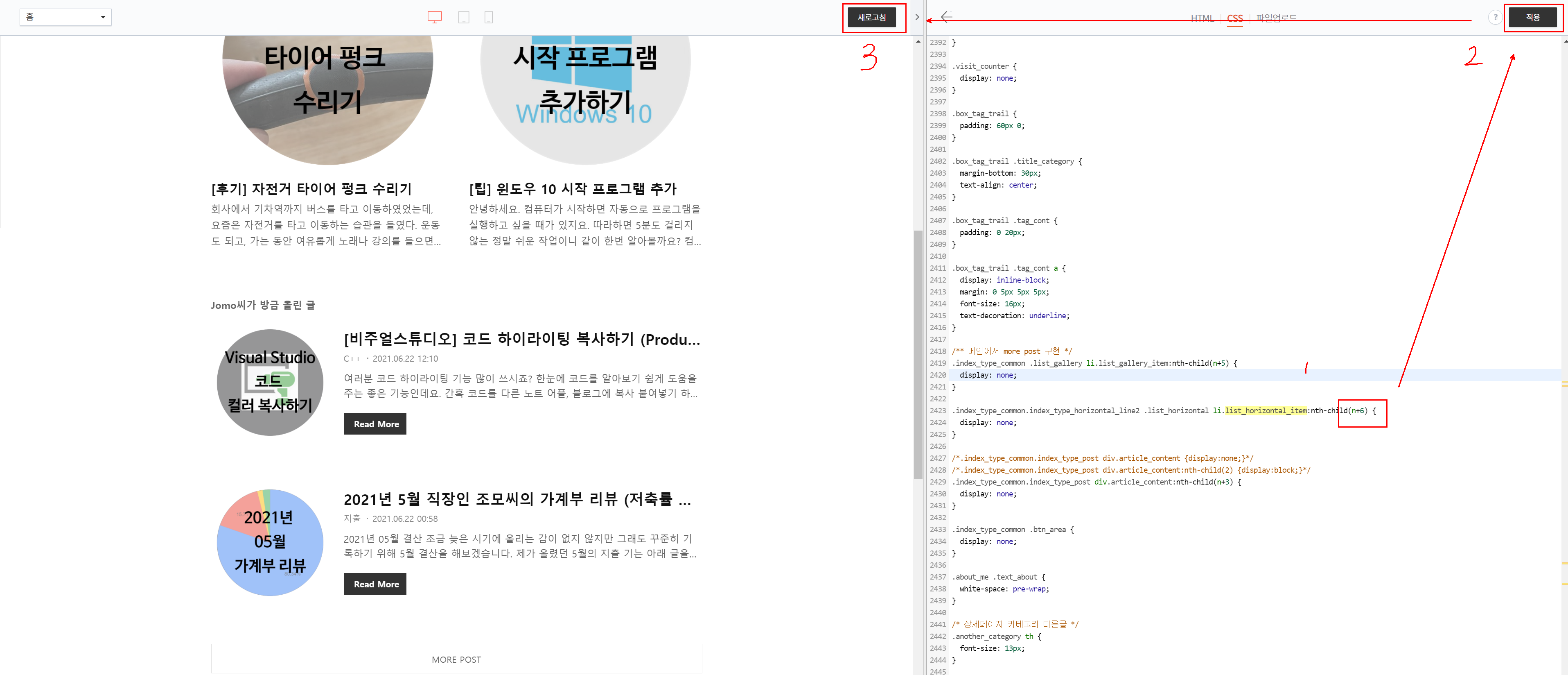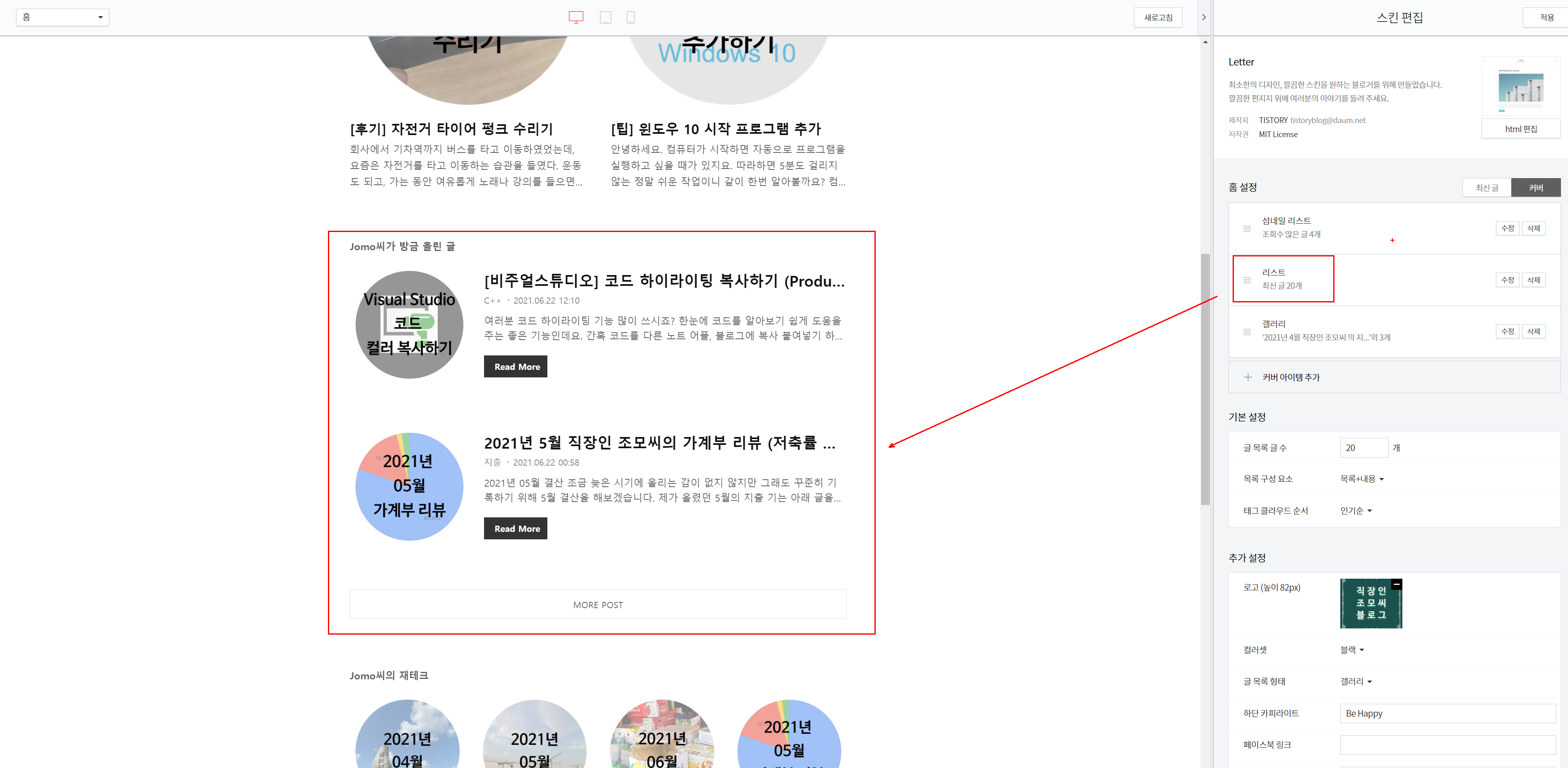 열심히 입맛대로 수정을 하고 있다가 아래 빨간 네모 부분에 최신 글이 표시되게 하고 싶었는데,