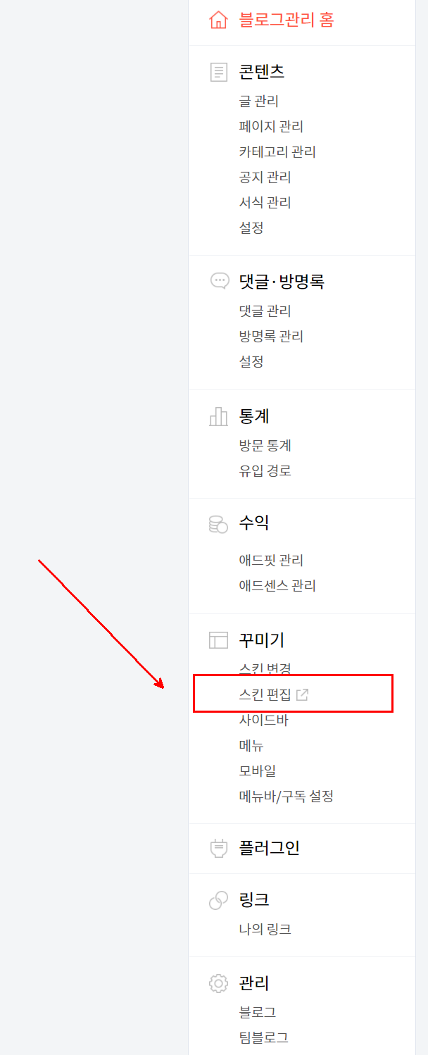 먼저 블로그 관리 홈 - 꾸미기 - 스킨 편집을 눌러주세요.
