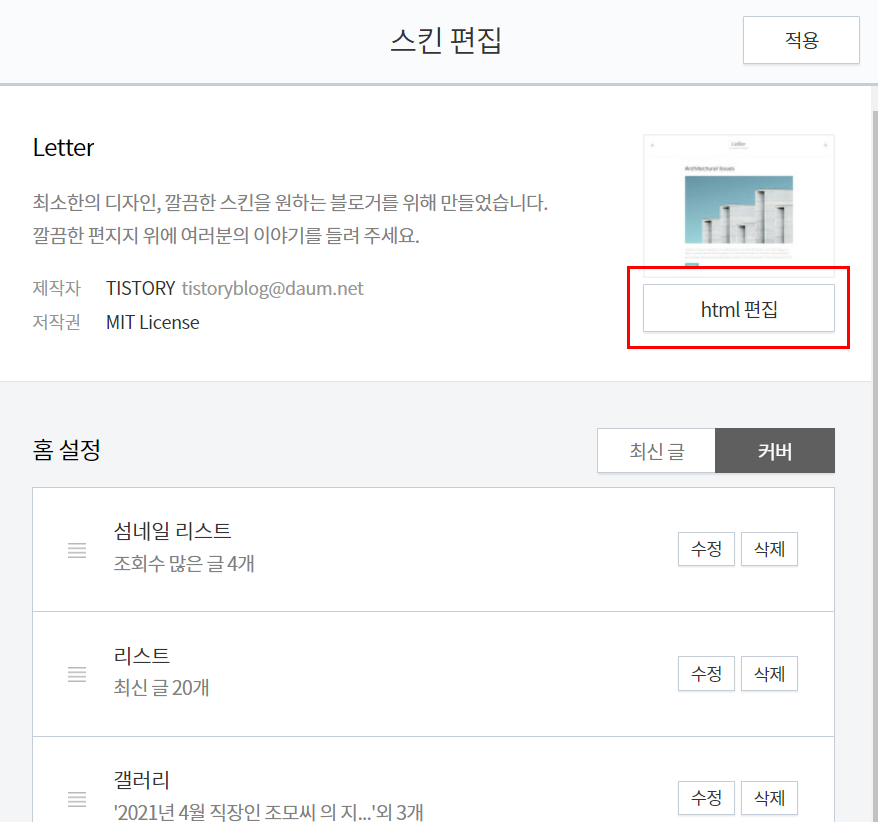 제가 사용하고 있는 티스토리 스킨은 기본 스킨인 'Letter 스킨'입니다.